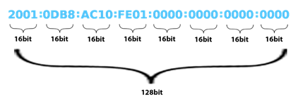 IPv6 128 bitlik hexadecimal(16 lık tabanda sayı) bir sayıdır. IPv6 yapısı aşağıda görülmektedir.