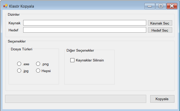 Uygulama içerisinde kaynak ve hedef klasörler seçilir. Ardından kopyalanacak dosya türleri ve kaynak dosyaların silinip silinmeyeceği seçilir. Bu parametrelerle kopyalama işlemi gerçekleştirilir.