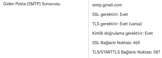 GMAIL SMTP Bilgileri