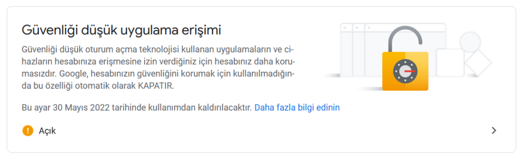 Varsayılan olarak GMAIL harici uygulamaların SMTP sunucusuna erişerek Eposta göndermesini engellemektedir. Bu engeli kaldırmak için 1. Adımda oluşturduğumuz Epostanın ayarlarına girerek güvenlik sekmesinden Güvenliği düşük uygulama erişimine izin vermeniz gerekmektedir.